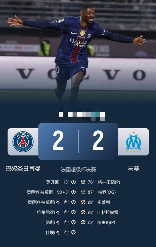 法国超等杯决赛,巴黎圣日耳曼与马赛在惯例时候2-2战平。
