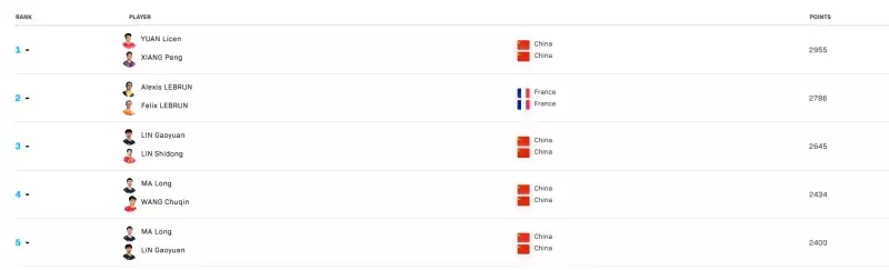 WTT最新一期男双排行,袁励岑/向鹏排行寰宇第一,冯耀恩/郭勇排行第十。