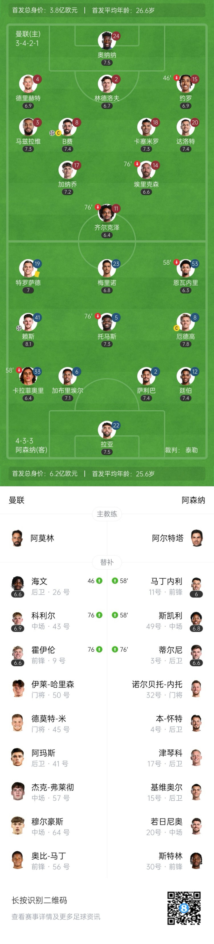 比赛第58、76分钟,阿森纳先后两次换东谈主,马丁内利、斯凯利和蒂尔尼先后登场。