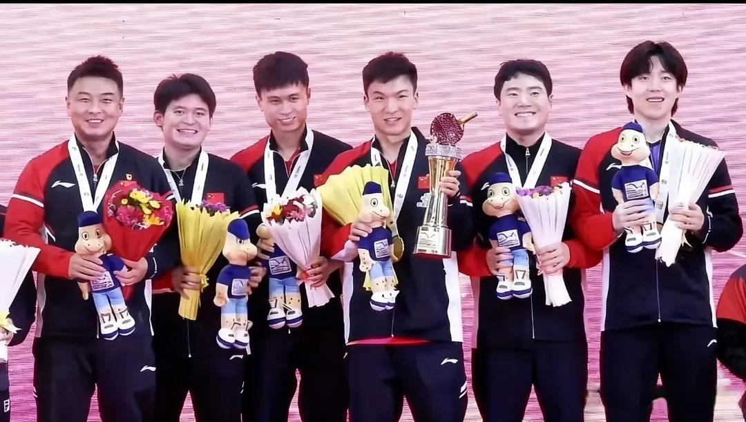 昨晚比赛放置后,等了一个半小时才运行授奖,先是给女团授奖,背面是给男团授奖。在授奖的本事看到国乒男队齐笑了,天下说向鹏被哥哥们作局站在C位了,授奖东说念主把奖杯给到向鹏时,看其他几个东说念主有点“坏笑”,看皓哥在傍边还憋笑呢,思笑就笑吧,这么看着好坚苦。猜想还在思刚刚林诗栋闻花的那一幕吧,哈哈,男队的氛围果然很自得,天下一直齐很好,可爱看他们笑的相貌。