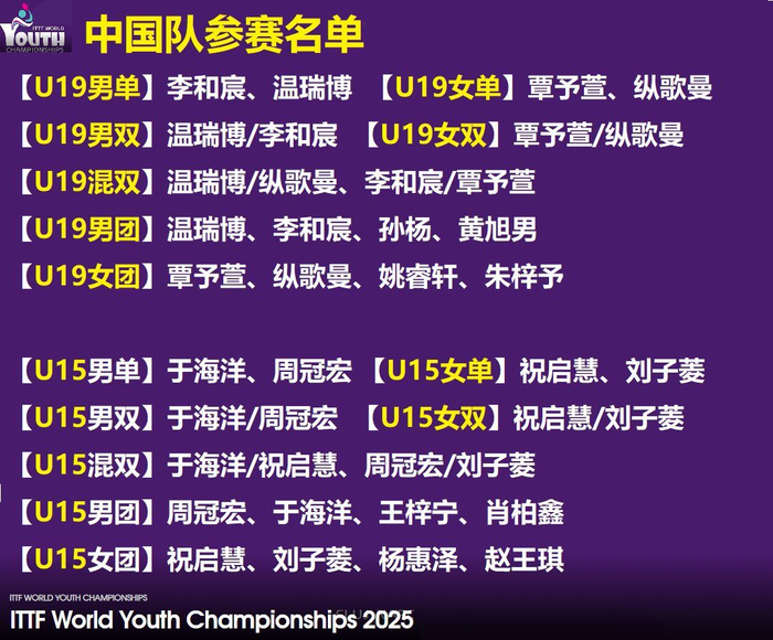 比赛将包括U19和U15两个年事组,设有:须眉单打、女子单打、须眉双打、女子双打、羼杂双打、须眉团体、女子团体。