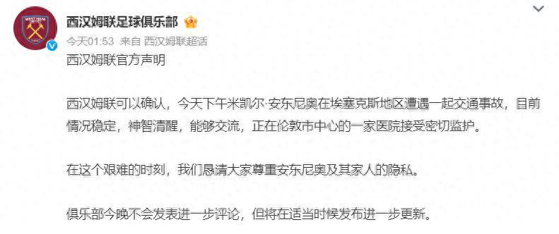 据西汉姆联官方说明,球队时尚安东尼奥在埃塞克斯地区遭受一齐交通事故,现在情况看法,神智知道,大概调换,正在伦敦市中心的一家病院收受密切监护。