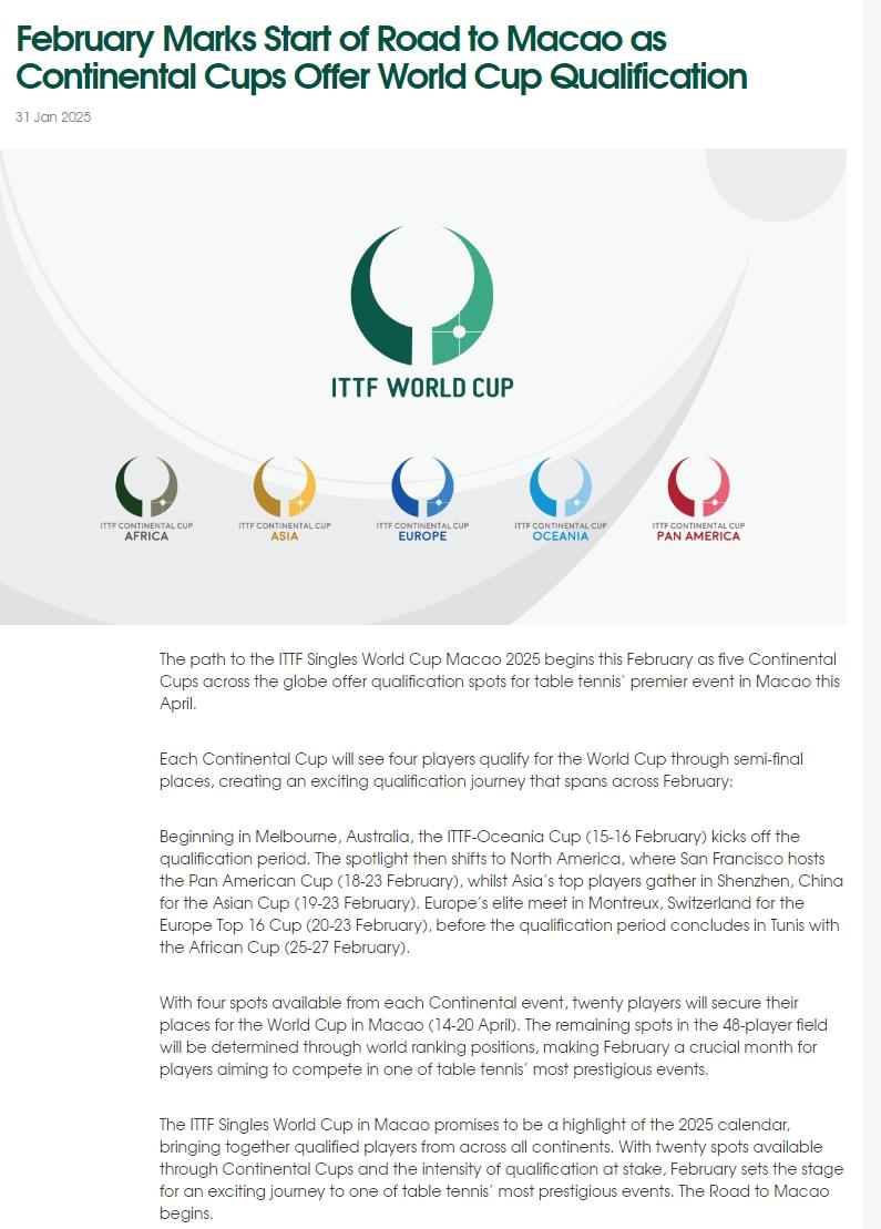 2025年海外乒联男人及女子宇宙杯(ITTF Men's and Women's World Cup 2025)是海外乒乓球积累会专揽的赛事体育录像/图片,于2025年4月14日至20日在中国澳门举行。