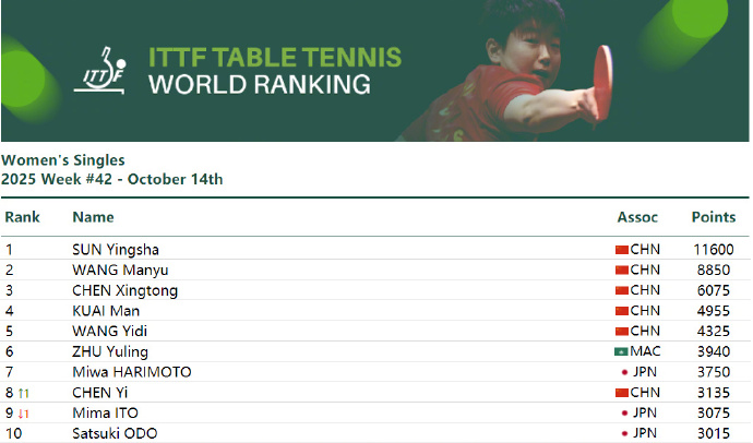 10月14日体育录像/图片,国外乒联更新2025年第42周天下名次:女片面,孙颖莎11600分联贯第170周霸榜第一,王曼昱8850分名挨次二,陈幸同6075分名挨次三。