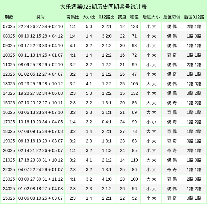 前区大小比:历史同时前区大小比为50:45,大数前区发达较热,最近5年同时前区大小比为13:12,大数前区发达较热;旧年同时前区大小比为1:4,本年瞻望大数前区数目占优,瞻望大小比为3:2。