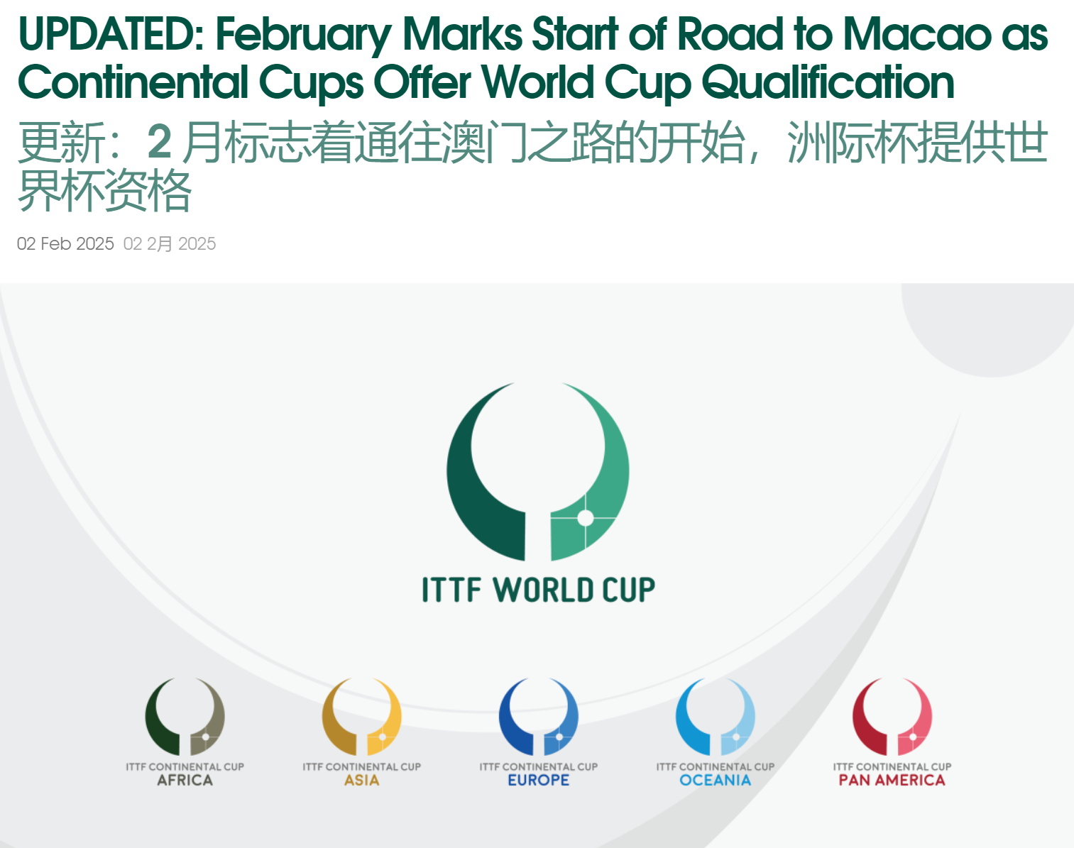 2月2日下昼,海外乒联公布了最新版的2025年澳门寰宇杯选定目的。球员们将通过环球五大洲举行的洲级杯赛事竞争参赛经历,赛事包括: