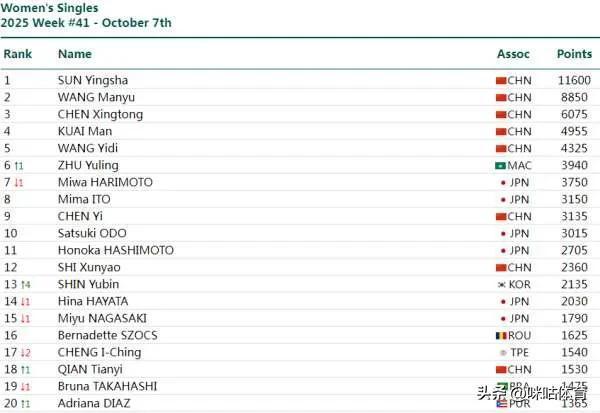 代表中国澳门参赛的朱雨玲排行第6,反超张本好意思和成为外协排行最高通顺员。