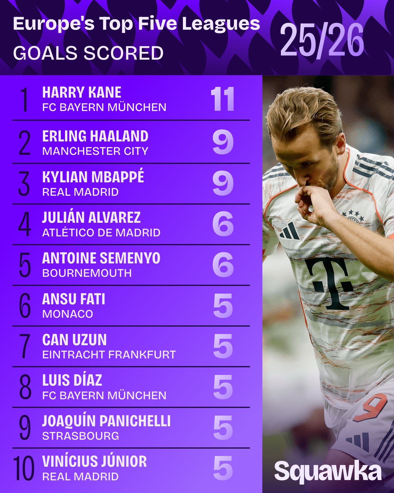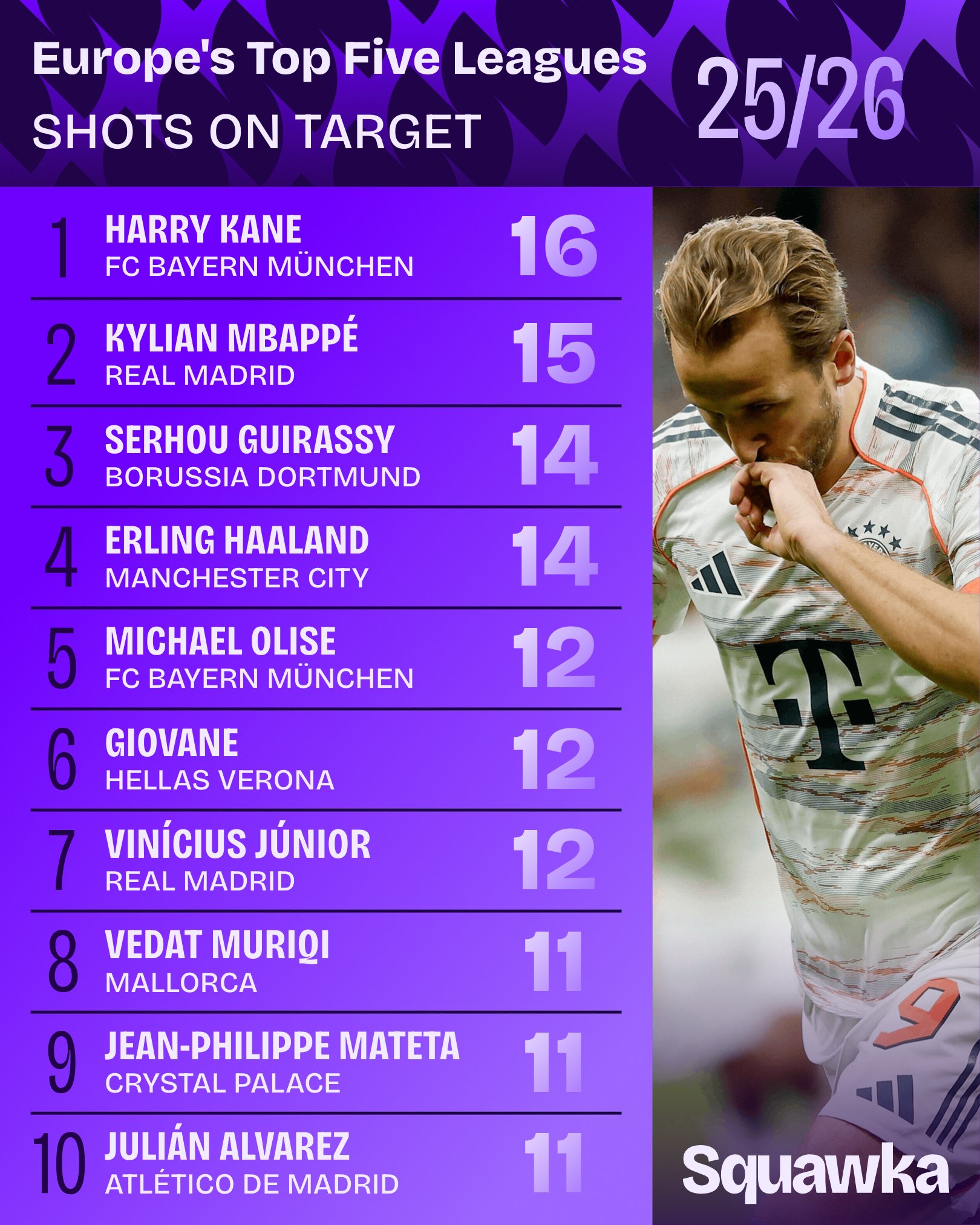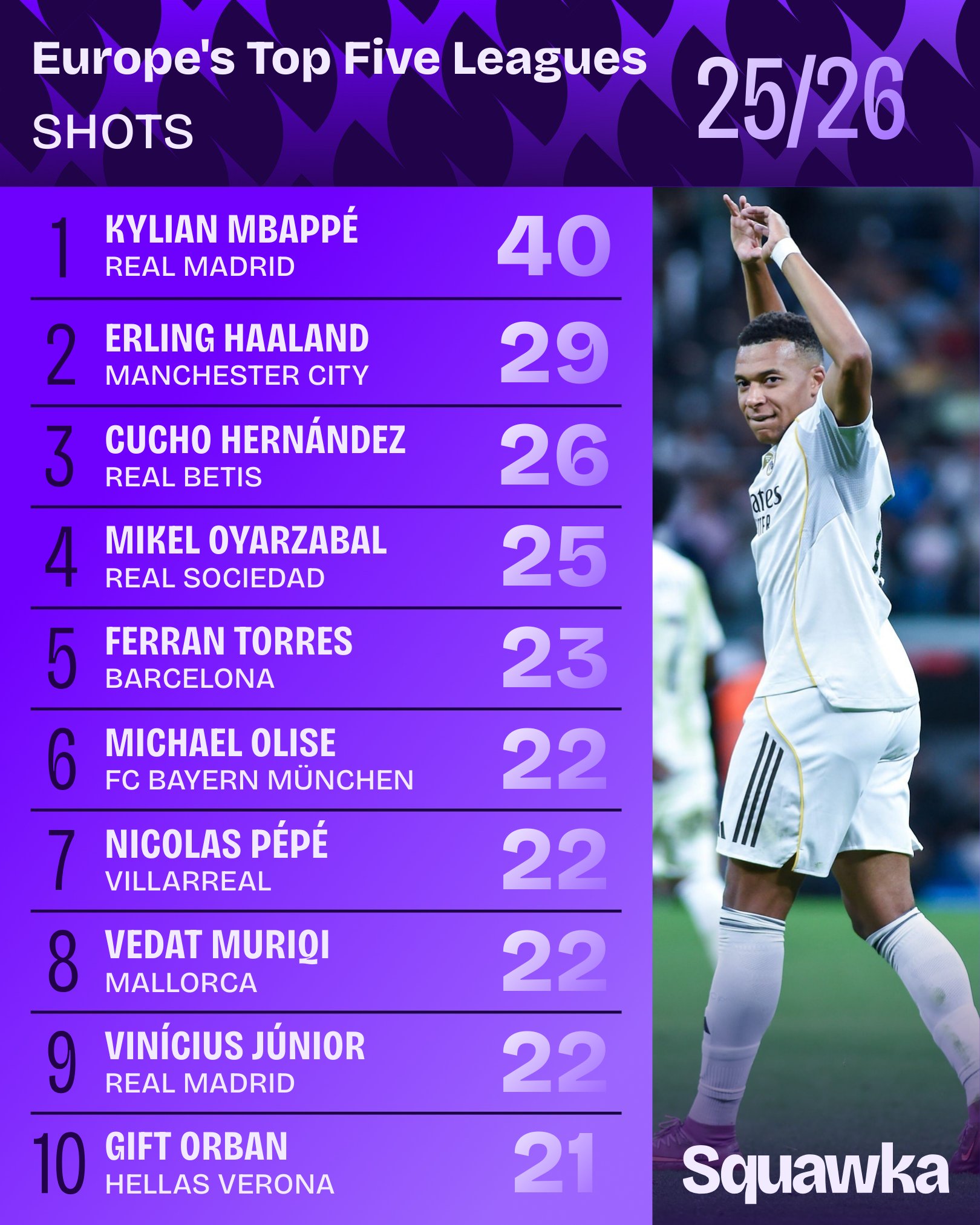 虎扑10月16日讯 Squawka数据统计本赛季于今五大联赛射门次数榜,姆巴佩40次名纪律一,哈兰德第二。