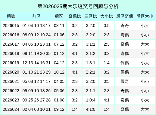 大乐透第26024期开出奖号:02、04、08、10、21 + 09、12。其中前区号码三区比为4:1:0,奇偶比为1:4,大小比为1:4,后区开疏淡数+偶数、大数+大数。